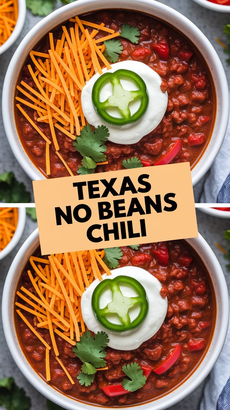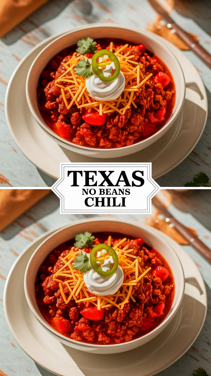 Traditional Texas chili avoids beans entirely. The focus stays on the meat, spices, and sauce.